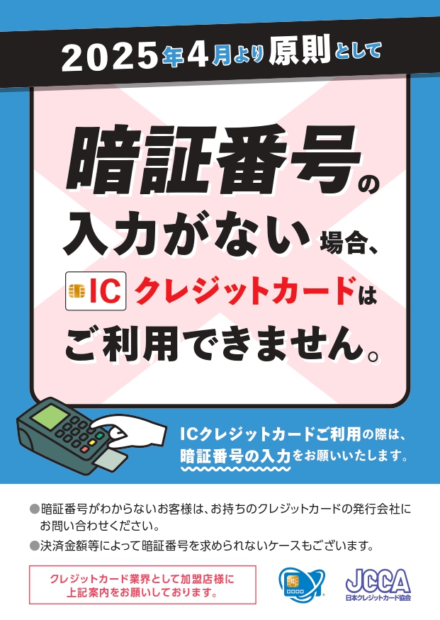 そのため、2025年4月より、原則として暗証番号の入力がない場合、ICクレジットカードはご利用できません。