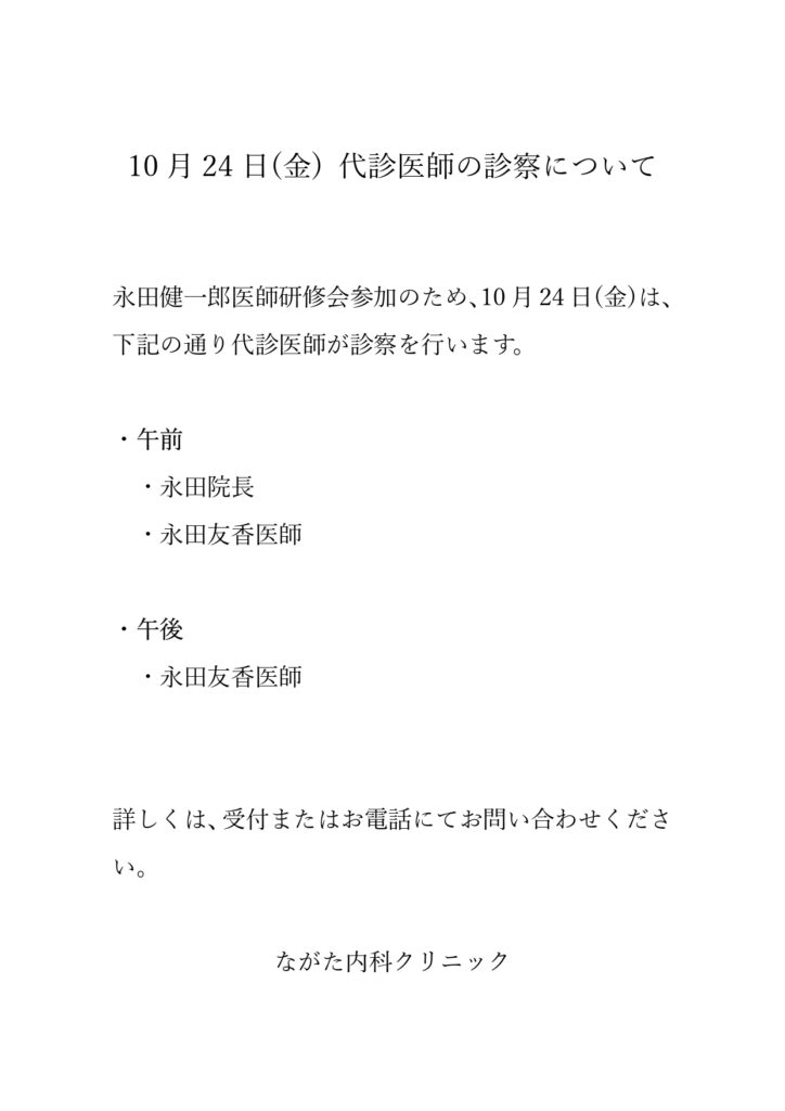 永田健一郎医師研修会参加のため、10月24日(金)は、下記の通り代診医師が診察を行います。