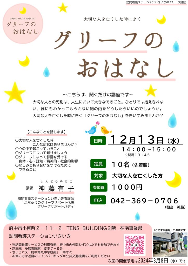 ※当ステーションのグリーフサポートは、大切な人を亡くした方であれば訪問看護サービスの利用有無・居住地問わずどなたでも参加できます。